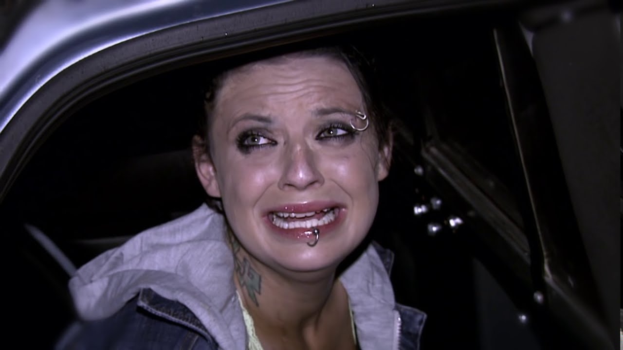 Then, when asked if she’s hiding anything else, the weight of the situation breaks her. She starts sobbing uncontrollably, her shoulders shaking under the flashing lights. Through tears, she reaches into her bra and pulls out two small plastic bags filled with meth.