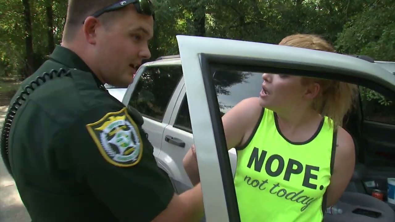 A second encounter starts in a grocery store parking lot. An officer stops an older SUV for expired tags. The driver, a middle-aged woman, laughs nervously as she searches for her license.